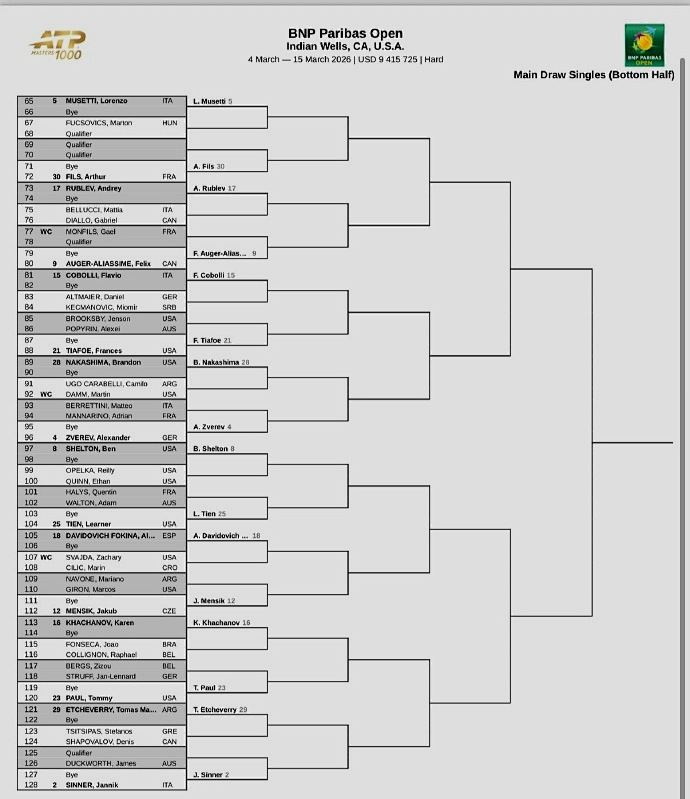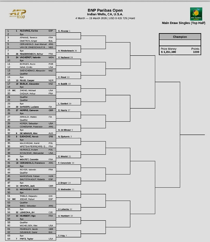 北京时间今晨,2026赛季ATP/WTA1000美国印第安维尔斯公开赛官宣了单打正赛签表。男子方面:世界前十悉数出战,前八大种子的对位如下:上半区,阿尔卡拉斯--德米纳尔、德约科维奇--弗里茨;下半区,穆塞蒂--兹维列夫、谢尔顿--辛纳。中国没有球员进入正赛签表,但有两位球员出战资格赛,他们是香港球员黄泽林和台湾球员曾俊欣。